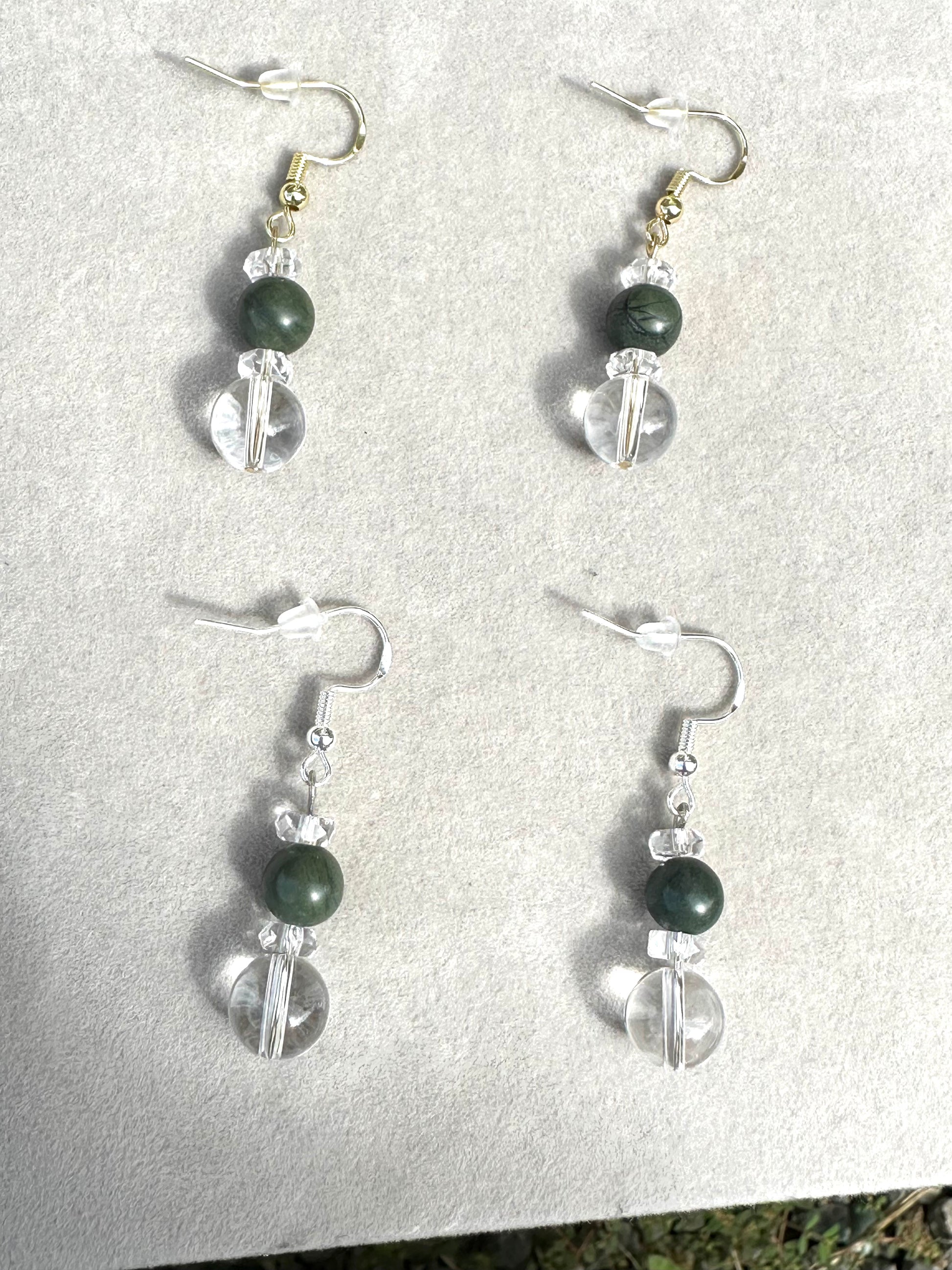 アオトラ8mmビーズと水晶10mmビーズ、水晶ボタンカットビーズを組み合わせたピアスです。